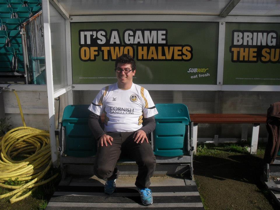| Jacopo sulla panchina del Truro City. Emozioni che solo i contesti del calcio anglosassone “minore” possono regalare. |