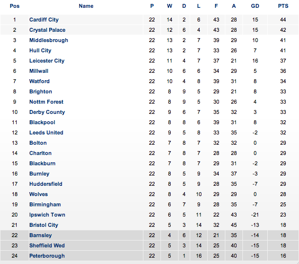 Anche in coda la classifica si accorcia, rendendo questo torneo più avvincente del solito ed equilibrato, proprio come avevamo previsto ad inizio stagione. Oltre alla già ricordata vittoria del Peterborough merita una citazione anche il trionfo esterno dello Sheffield Wednesday sul Barnsley. Soddisfatto Dave Jones: “Non è stata una bella gara, ma abbiamo vinto. La fortuna ci ha assistito e comunque abbiamo meritato perchè abbiamo lottato duramente fino alla fine.”