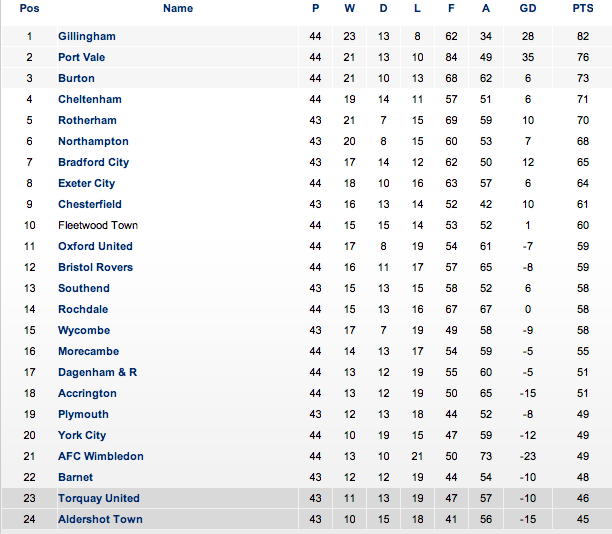 In zona retrocessione, perdono le ultime tre ed il Wimbledon, grazie al pareggio casalingo contro l’Exeter, guadagna un punto sul Barnet di Edgar Davids (che comunque andrà a finire la stagione, è riuscito in un’impresa clamorosa, vista la condizione in cui si trovava la squadra al suo arrivo). Tra le gare più importanti della prossima giornata c’è sicuramente Torquay-Barnet, vero e proprio spareggio salvezza.