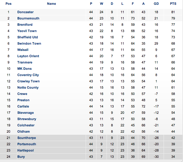 Promozione acquisita per il Doncaster che va a vincere anche sul campo del Crewe. E’ lotta serrata tra Bournemouth e Brentford con i secondi che hanno una partita da recuperare e potrebbero sfruttare questa situazione per sferrare l’attacco alla promozione diretta. Non molla lo Yeovil Town che ottiene la terza vittoria consecutiva, ma lo Sheffield United che ha giocato solo 42 partite, potrebbe essere la vera rivelazione di questo finale di stagione. Complici i problemi societari e la modifica della guida tecnica, lo Swindon Town sta crollando: terza sconfitta consecutiva e avversarie che si avvicinano pericolosamente, minando così la posizione playoff. Non ne approfitta il Walsall, fermato in casa dallo Scunthorpe ed il Leyton Orient lo aggancia in settima posizione.