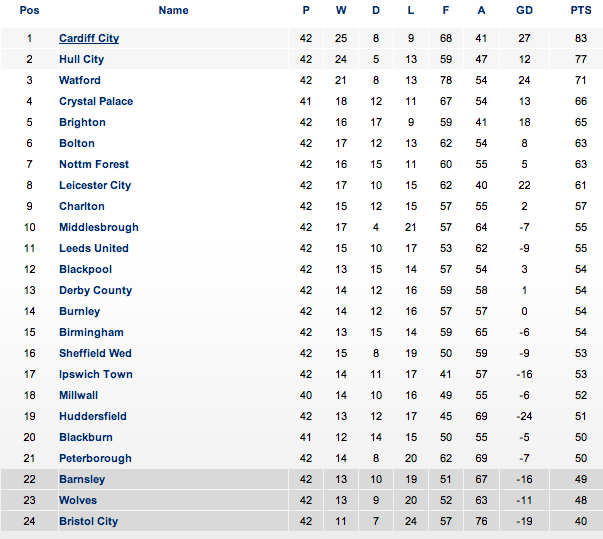 A quattro giornate dal termine, il Cardiff City è a soltanto un punto dalla promozione. La rotonda vittoria per 3-0 su un Nottingham Forest ridotto in 10, apre la strada verso il massimo torneo inglese. A favorire la promozione matematica ci pensa il Watford di Zola che cede 3-0 al Peterborough e perde così punti importanti in vista del secondo posto che ormai è sempre più nelle mani dell’Hull City, uscito vittorioso dalla difficile trasferta sul campo dell’Ipswich Town. In zona play-offs nessuna squadra riesce a staccare le altre. Il Crystal Palace viene bloccato in casa dal Barnsley e vede la propria posizione minacciata dal ritorno del Brighton vittorioso sul campo del Middlesborugh che sigilla così una seconda parte di stagione molto deludente e ben al di sotto delle aspettative iniziali. Il Bolton approfitta del passo falso del Forest per agguantare la sesta posizione, ultima utile all’accesso ai playoff. Si prospetta molto interessante la sfida del turno infrasettimanale che martedì metterà di fronte Bolton e Leicester City.