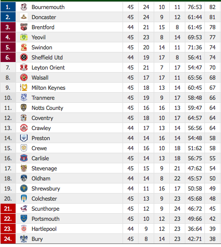 Rischia moltissimo il Doncaster che assisterà con attenzione alla gara tra Brentford e Hartlepool, decisiva sia per la promozione che per la salvezza. La sconfitta odierna contro il Notts County mette a rischio la promozione. Intanto delineata la situazione nei playoff: Yeovil, Swindon Town e Sheffield United sono certe di partecipare alla post season.
