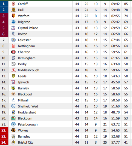 L’unico verdetto della 44° giornata è la vittoria matematica del campionato da parte del Cardiff grazie al pareggio dell’Hull City contro il già retrocesso Bristol City. Il Watford vince con un rotondo 4-0 contro il Blackburn (ancora nell’incubo retrocessione) e si porta a -4: distanza che appare eccessiva a due giornate dal termine e sono molti i rimpianti per i tanti punti gettati al vento. In zona playoff, dove niente è ancora deciso, passo in avanti importante del Brighton e del Bolton che grazie alla vittoria sul Middlesbrough e al concomitante pareggio del Leicester si porta al sesto posto. Perde una grande opportunità il Nottingham Forest che non riesce ad andare oltre il pari in casa contro il Barnsley.