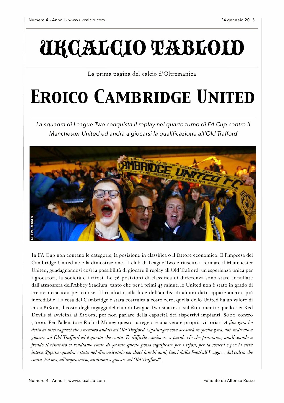 UKCALCIO TABLOID è la prima pagina del calcio d’Oltremanica. In questo numero speciale spazio all’impresa del Cambridge United in FA Cup.