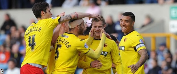 I CANARIES VOLANO A UN PUNTO DAL BOURNEMOUTH E SOGNANO LA PREMIER. IL WATFORD BATTE IL MILLWALL AL THE DEN CON DUE RETI. ANCHE IL MIDDLESBROUGH RIMANE IN LOTTA PER LA PROMOZIONE E CHIUDE LA PARTITA NELLA RIPRESA. IL DERBY SOFFRE IL BRENTFORD E ALLO SCADERE TROVA IL PARI CON BENT.