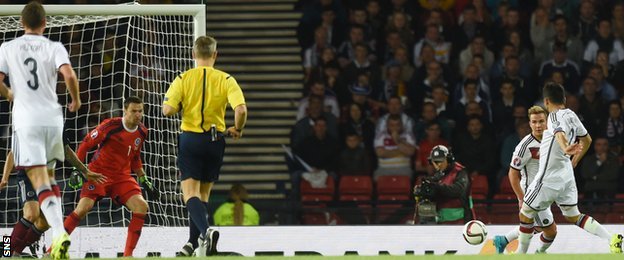 In questi minuti si è vista chiaramente la differenza di tasso tecnico tra le due formazioni, ma la Scozia tutto sommato riesce a chiudersi bene e a creare qualche spauracchio a Manuel Neuer, come al 28° minuto con Maloney che tenta di sorprendere il portierone tedesco che para agevolmente, ma che pochi secondi più tardi non può nulla sulla deviazione di Hummels che finisce per mandare il pallone nella propria porta: 1-1.