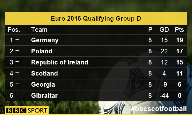 Gordon Strachan, ct della Scozia, conferma otto undicesimi della formazione scesa in campo nella partita contro la Georgia (persa 1-0). Nel suo 4-2-3-1, in porta come al solito va Marshall, nella linea a quattro partono Mulgrew, Hanley (preferito a Robertson), Martin e Hutton. Davanti alla difesa si schierano Brown e McArthur (new entry di serata) mentre dietro al confermato Fletcher giocano Maloney, Morrison e Forrest.