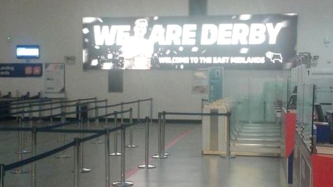 Lo striscione del Derby County nella hall della sala immigrazione dell’aeroporto.