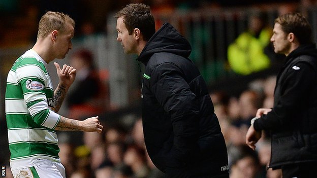 Ronny Deila, allenatore del Celtic, discute con Griffiths durante l’incontro.