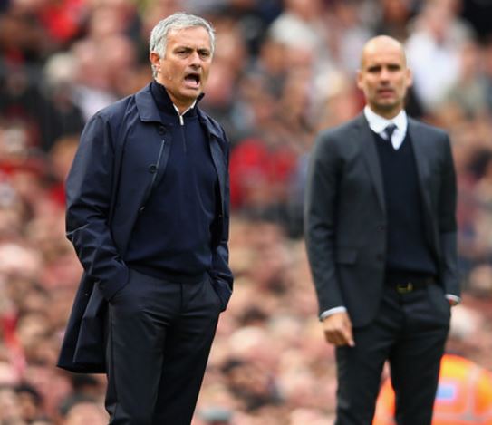 José Mourinho e Pep Guardiola durante il match di Premier League tra Manchester United e Manchester City. (foto: www.zimbio.com)