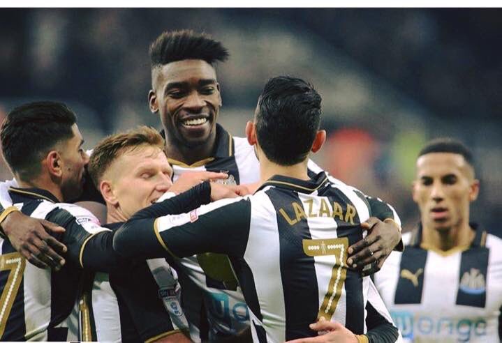 | I giocatori del Newcastle festeggiano davanti ai propri tifosi un’altra imponente vittoria. (foto: @LazaarAchraf) |